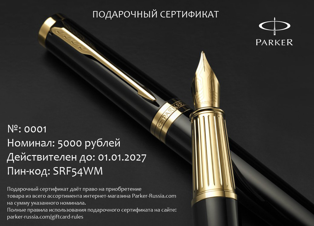 Подарочный сертификат Parker 5000 от официального дилера Parker в Старом Осколе. Вы можете дополнительно заказать гравировку, которая подчеркнет Вашу оригинальность и придаст памятность статусному подарку. Все ручки Паркер поставляются в фирменном футляре.
